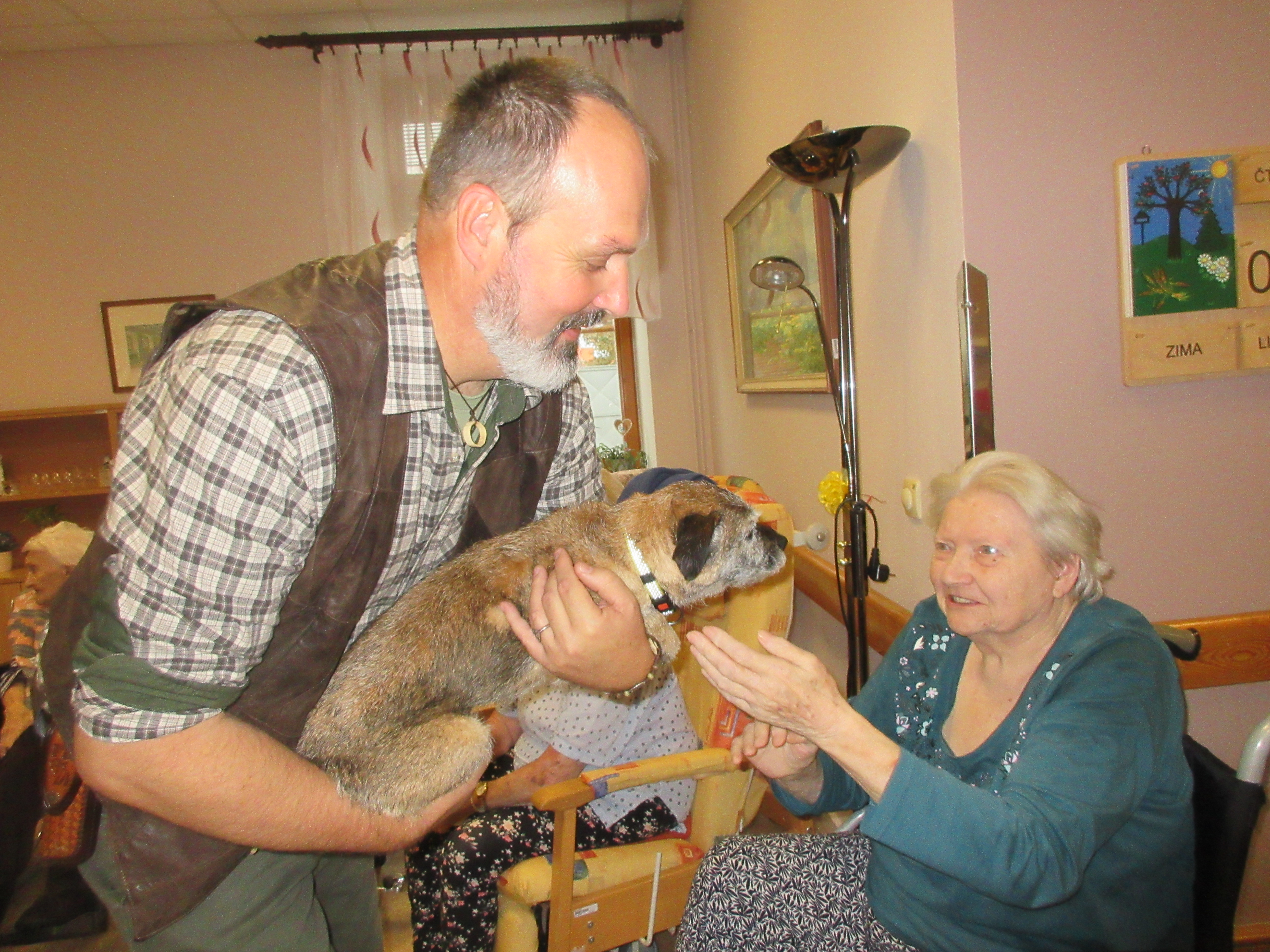 Závěr besedy všem přítomným zpříjemnila přítulná fenka Alma, která se nechala pochovat, pohladit i podrbat. Ukázala nám, jak poslouchá povely, které páníček František dával, a rozloučila se hlasitým zaštěkáním. Oba od nás sklidili bouřlivý potlesk a úsměvy ve tvářích uživatelů i zaměstnanců. Mnohokrát děkujeme!