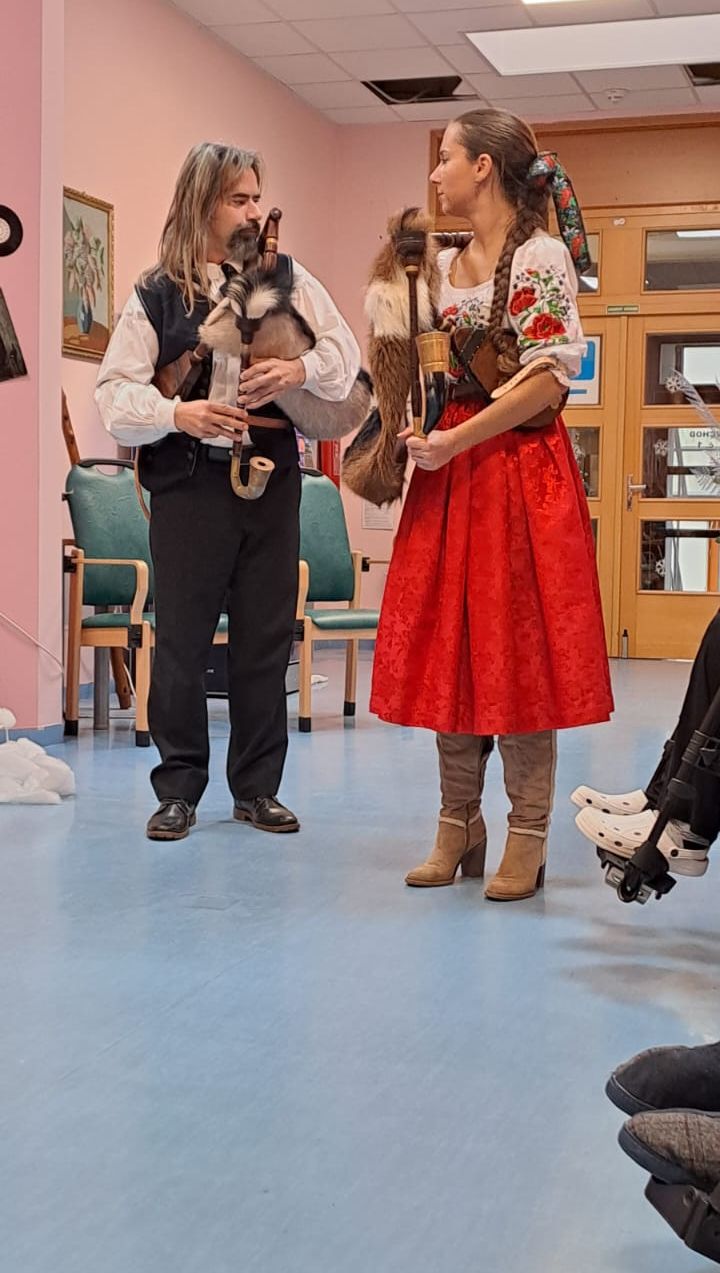 Opravdu nevšední zážitek z jejich vystoupení jsme si mohli vychutnat i v našem centru ve středu 11. prosince 2024 odpoledne. Muzikanti nám přiblížili historii dud, ale i dalších pastýřských nástrojů – fujary a píšťaly. Formou hádanek a vyprávěním příběhů nám představili nástroj, který dnes známe už jen z pohádek. Dozvěděli jsme se například, že i když je zvuk dud velmi často spojován se Skotskem, v minulosti se jednalo o běžný hudební nástroj u nás a jeho varianty dosud nacházíme v lidové hudbě.