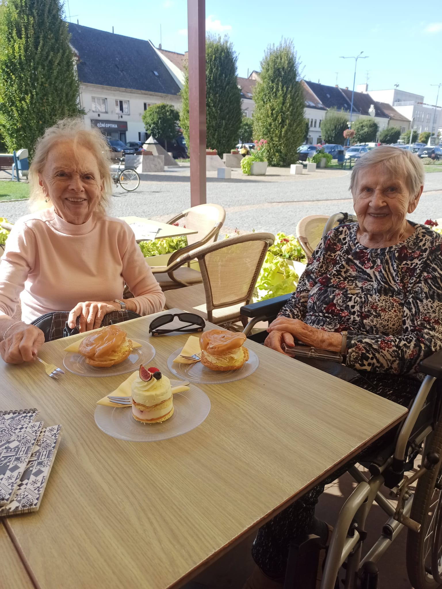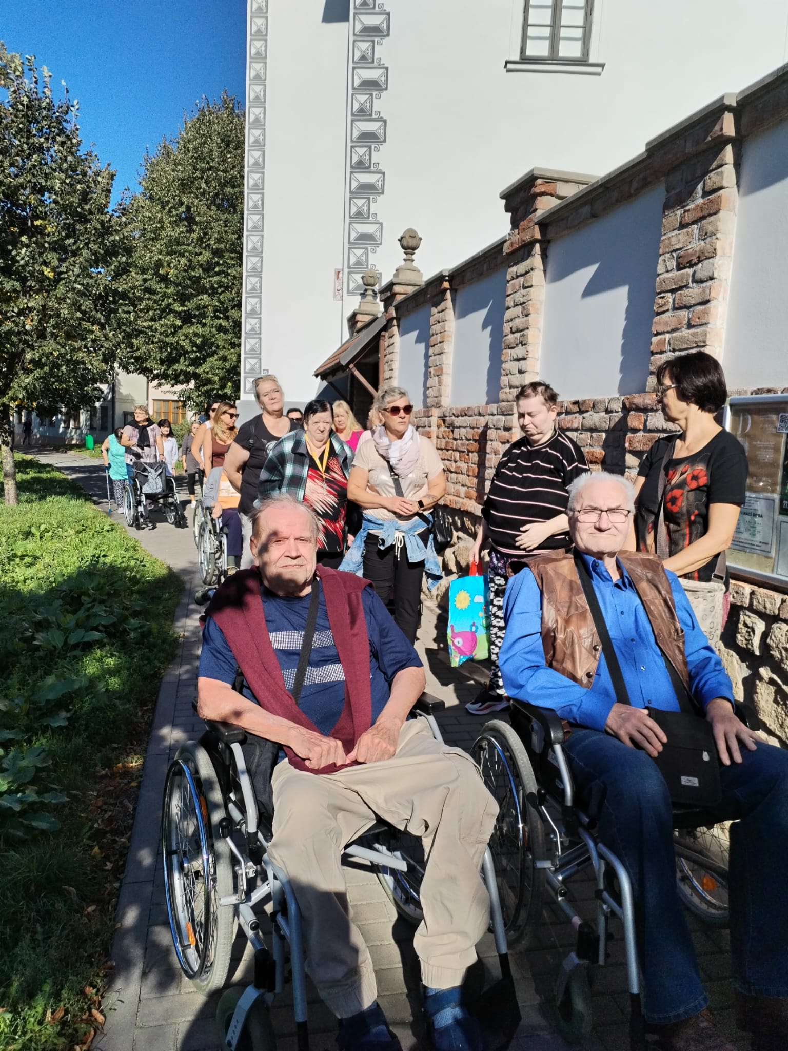 V pondělí 22. září 2025 se uskutečnil náš poslední letošní větší výlet. Obava ze špatného počasí se rozplynula v krásném, slunečném ránu, a tak náš autobus plný nadšených výletníků vyrazil směrem na jižní Moravu. Předpověď počasí sice slibovala pořádné ochlazení a déšť, ale my jsme měli opravdu štěstí, protože to všechno přišlo až k večeru. Naším cílem byl Kyjov, kde nás čekala prohlídka vlastivědného muzea v místním renesančním zámečku. Všichni jsme si se zájmem prohlédli expozici o místní přírodě, historii a v patře pak i národopisnou výstavu. Poté už nás čekala příjemná procházka po náměstí s historickou radnicí a pěkným kostelem a také zajímavou moderní fontánou. Příjemné slunečné počasí naše uživatele vylákalo na náměstí i do zahrádek, kde si každý podle své chuti mohl vybrat z lákavé nabídky zákusek s kávou v cukrárně nebo burčák v příjemném posezení před vinotékou. Vždyť krásný teplý den na jižní Moravě je přece ten pravý čas pro ochutnávku burčáku od místních vinařů!