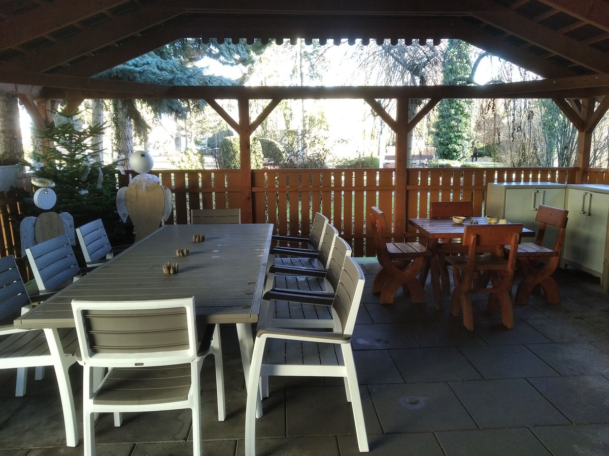 Tento altán je v barvě tmavě rezavé a prosvětlení v bílo-šedém odstínu byl dobrý nápad. A tak jsme zakoupili v těchto barvách velký stůl s židlemi, truhlíky na zábradlí altánu k osázení sezónními rostlinami a plastové skříňky k úschově podsedáků, zahradního nářadí a dalších drobností. Pořídili jsme do altánu také dekorace, v těchto dnech zpříjemňují jeho prostředí vánoční girlandy.