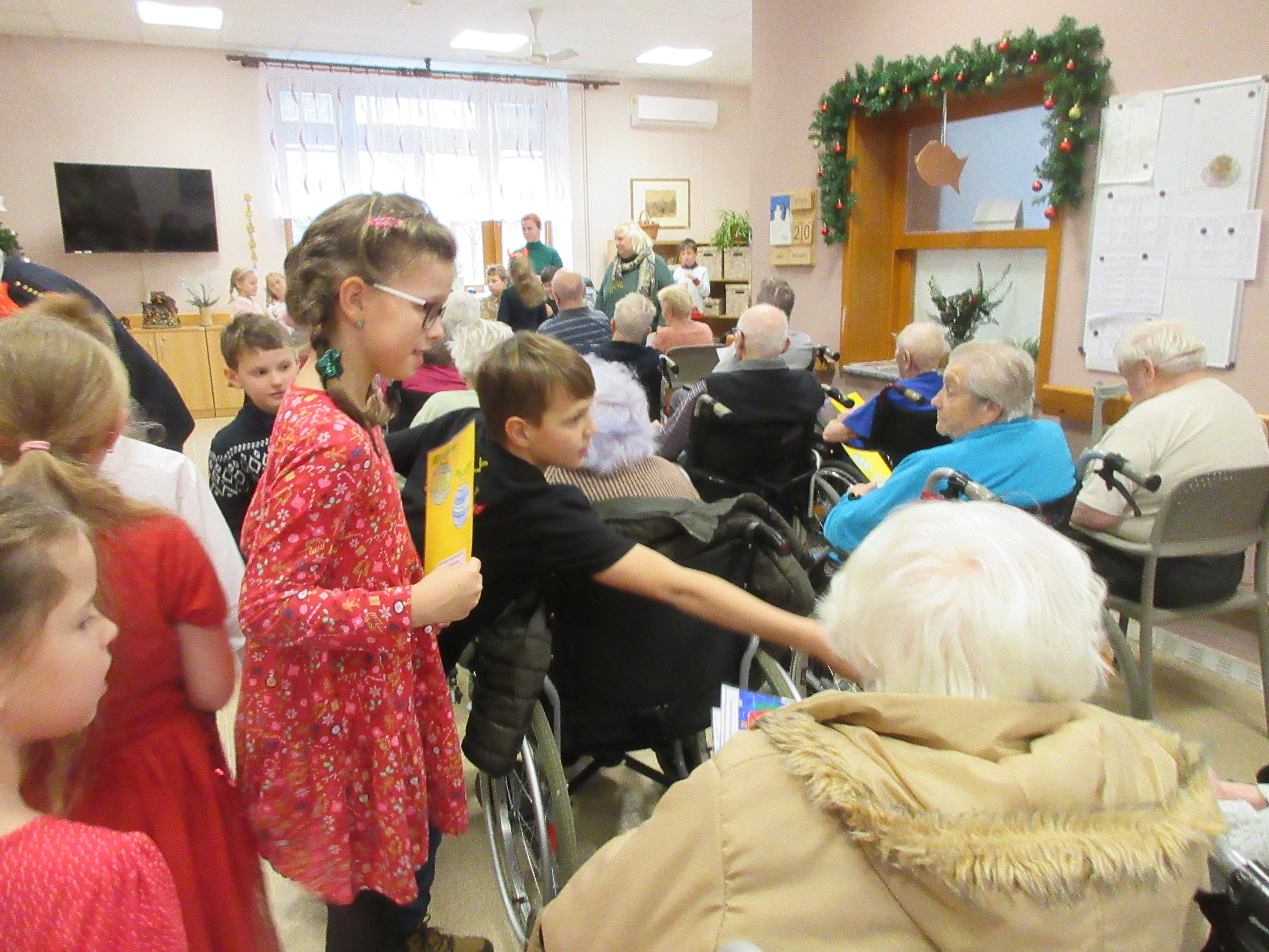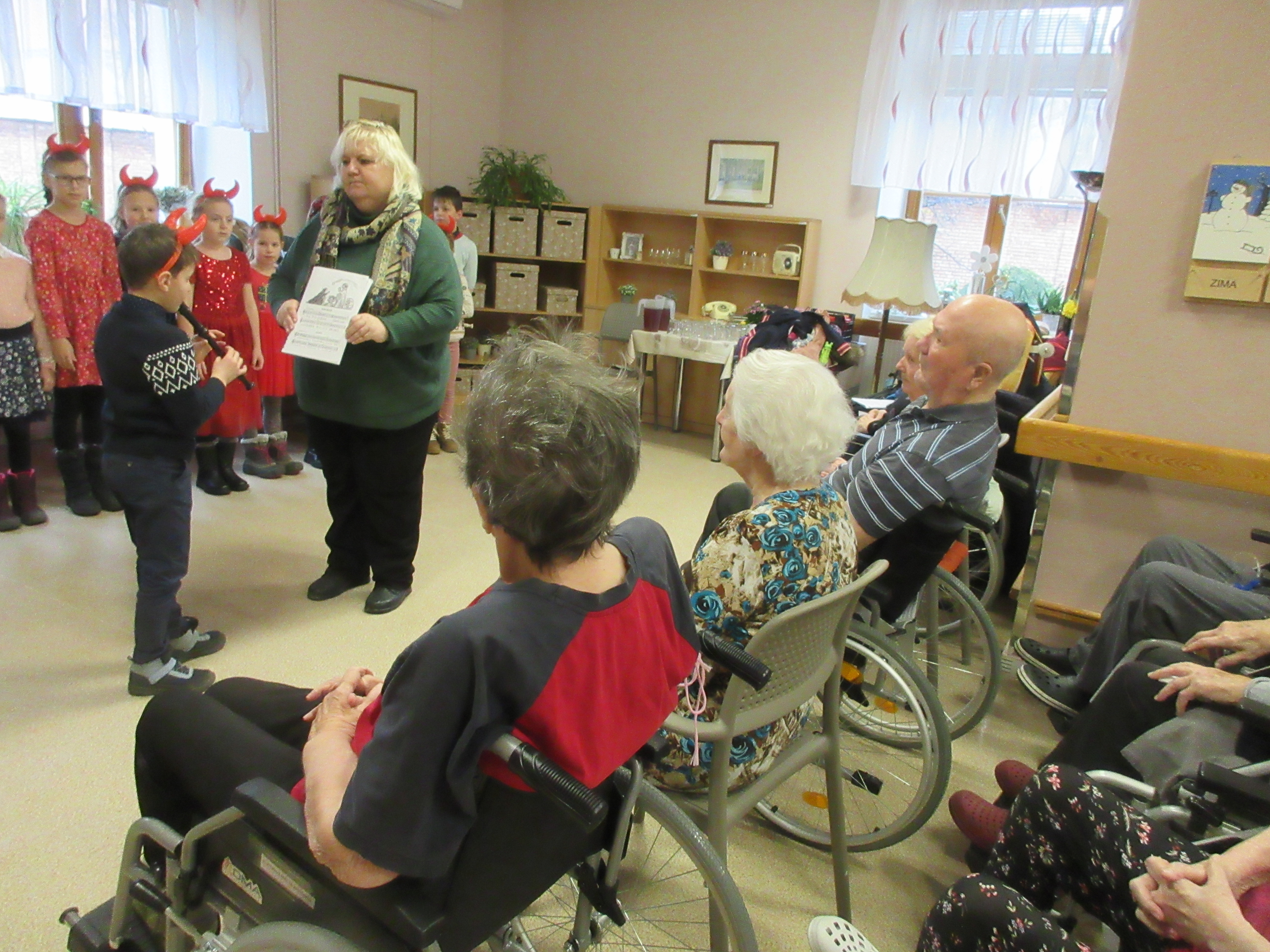 Pouhé čtyři dny zbývaly do Štědrého dne a naše zařízení navštívily v tomto předvánočním čase děti z Určic. Jako každý rok i letos si paní učitelky daly velkou práci s nacvičením hudebního pásma. Malí umělci krásně nastrojeni ve vánočním duchu každého dojali, rozesmáli a hlavně vánočně naladili. Recitace se sklopenými zraky a ruměnci ve tvářičkách těch nejmenších školáků byly tak milé a všechny pohladily po duši. Vždyť snad každý si rád zavzpomíná na dobu, kdy byl malý a tohle zažíval. Proto měl každý pochopení a ocenil snahu a dovednost školáčků. Tanečky v páru na krásnou vánoční hudbu byly pomyslnou třešničkou na dortu. Individuální výkony malých umělců na hudební nástroje a sehraná scénka v tomto povedeném pásmu také nechyběly.